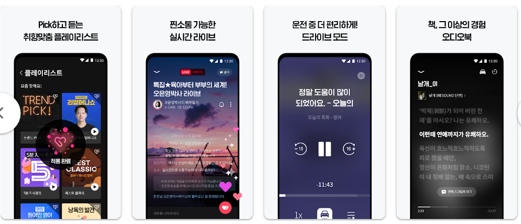 • 오디오북, 오디오 드라마, 강연, 어학, ASMR, 웹소설 등 다양한 장르 제공