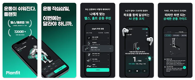 지금부터 운동기록 어플을 추천해 드리겠습니다. 플랜핏은 운동 목표에 맞춰 맞춤 루틴을 추천하고 운동 기록을 관리할 수 있는 피트니스 앱입니다. 헬스장 운동과 홈트레이닝 모두 지원하며 AI가 사용자의 운동 데이터를 분석해 개인에게 최적화된 루틴을 제공합니다. 운동 초보자도 쉽게 사용할 수 있도록 운동 방법과 자세 가이드가 제공되어 체계적인 운동 습관을 만드는 데 도움을 줍니다.