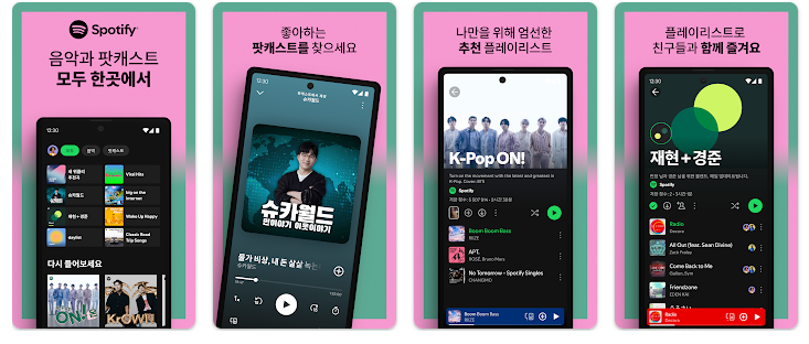 Spotify 앱은 사용자 맞춤 음악 추천 기능과 수천만 곡의 음악 라이브러리를 갖추고 있어 청취자의 취향에 맞는 플레이리스트를 제안하며, 음악 검색, 아티스트 탐색, 팟캐스트 구독 등이 가능하도록 설계되어 있습니다. 추가로 특정 요금제를 구독하면 광고 없이 음악 감상, 오프라인 다운로드 재생 등 프리미엄 기능을 이용할 수 있습니다.