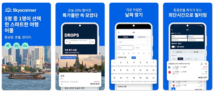 특히 다양한 항공사와 여행사의 항공권을 동시에 검색할 수 있으며 가격 알림, 유연한 날짜 검색, 여행지 탐색 기능 등을 통해 여행 비용을 비교하고 계획을 세우는 데 활용할 수 있는 대표적인 항공권 가격 비교 앱입니다.