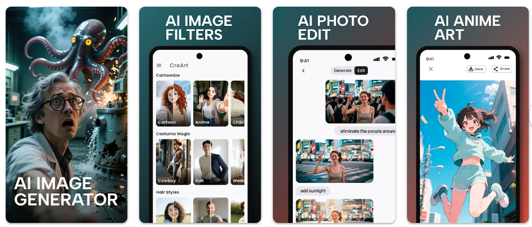 지금부터 무료 이미지 생성 ai 어플을 소개해 드리겠습니다. CreArt는 스마트폰에서 텍스트만 입력해도 독창적인 그림을 만들어주는 AI 이미지 생성 및 편집 도구입니다. 이 앱은 단순히 사진을 보정하는 기능뿐 아니라 상상하는 아이디어를 생생한 이미지로 변환해 주는 창작 도구로 설계되어 있습니다. 수많은 예술 스타일을 선택할 수 있고, 사진 편집 기능을 함께 제공해 크리에이터부터 일반 사용자까지 폭넓게 활용할 수 있는 것이 특징입니다.
