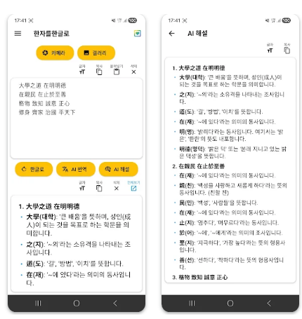 또한 AI 기반 번역 엔진을 사용해 정확도를 높이고 한자와 한글을 동시에 비교해 보여주는 UI를 제공해 초보 학습자도 쉽게 의미를 이해할 수 있도록 도와줍니다.