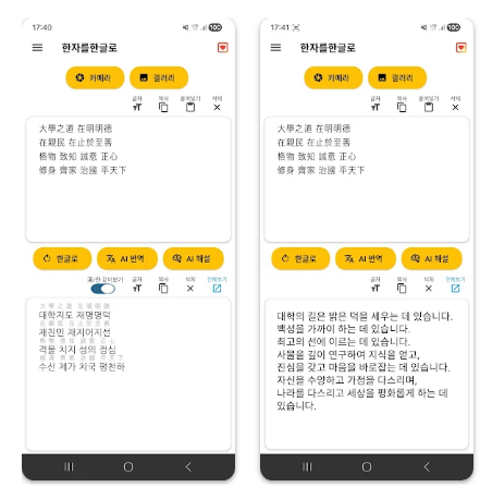 - 한자와 한글 같이 보기: 한자 원문과 번역 결과를 비교해서 확인할 수 있는 UI를 제공합니다.