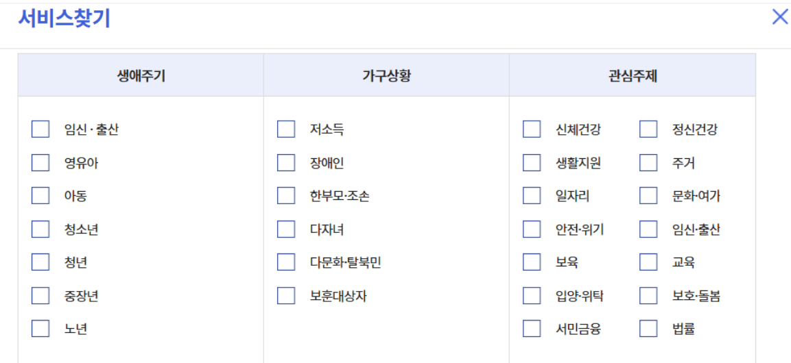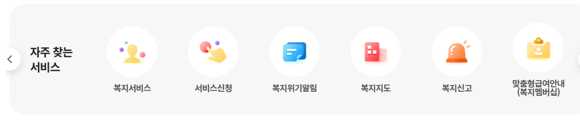 - 서비스 검색 : 상단 메뉴 중 ‘복지서비스 신청’ 또는 ‘서비스 찾기’ 기능을 통해 지원 대상 및 종류를 조회합니다.