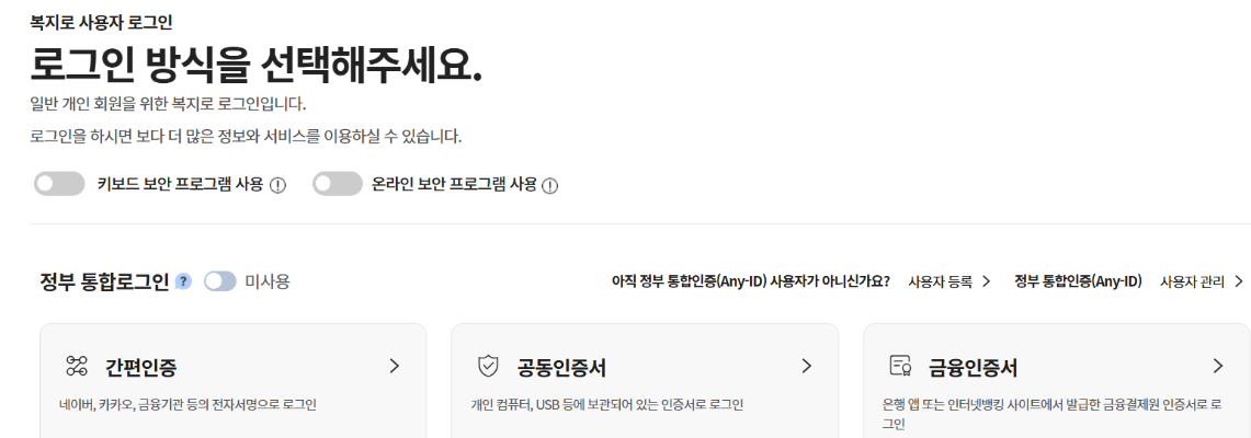 - 접속 환경 확보 : 공동·금융인증서 로그인이나 간편인증 시 보안 프로그램 설치가 필요할 수 있습니다.